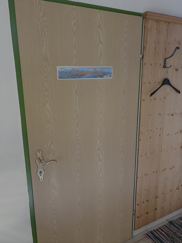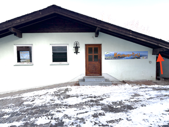 Zugang ist im oberen Teil. Am Ladentag ist die Türe offen. Eine Abholung außerhalb der Ladenzeiten ist über Schlüsel (Anleitung f. Mitglieder siehe Info - Zugang zum Laden) möglich.